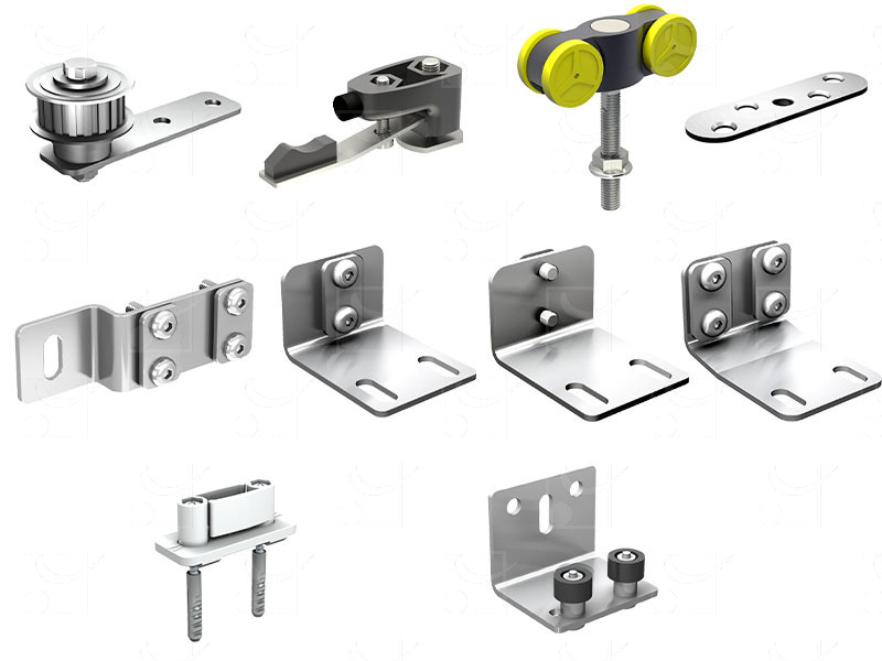 Gear for three doors weighing max. 80 kg each and an opening of max. 4.5 m, with screw-in, edge-mounted stainless steel plates.