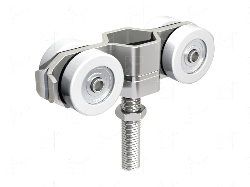 Monture avec armature Inox équipée de 4 galets bandage Nylon montés sur roulement à billes axe de diamètre M8 (platine 0036XM8).