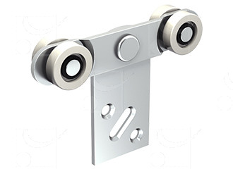 Monture avec support fixation sur plat, 4 galets nylon montés sur axe lisse. Capacité/porte : 14 kg. Rail associé 9001.