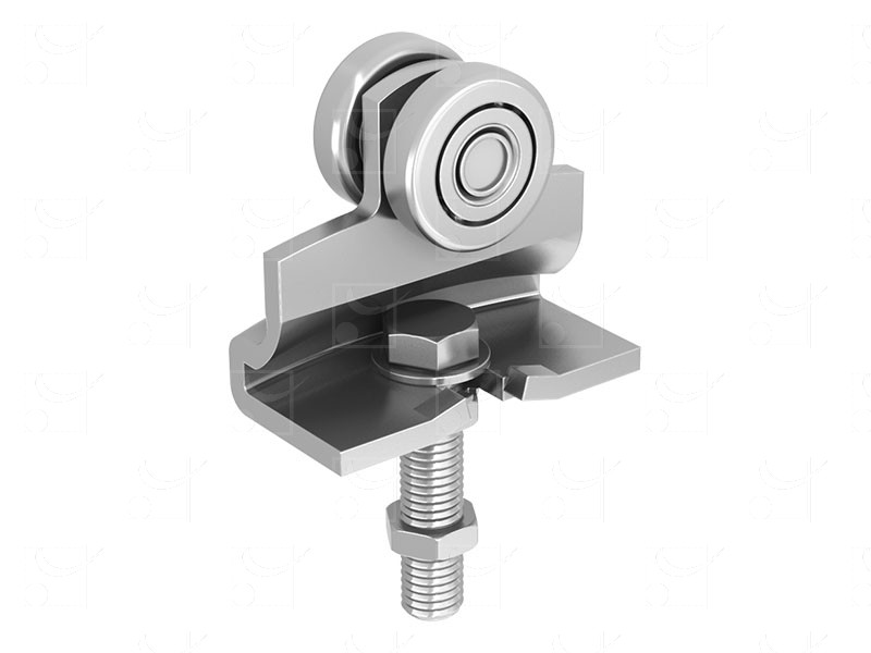 Monture avec support col de cygne, 2 galets en acier montés sur billes. Vis M16. Capacité/porte : 400 Kg. Rail associé 9050.