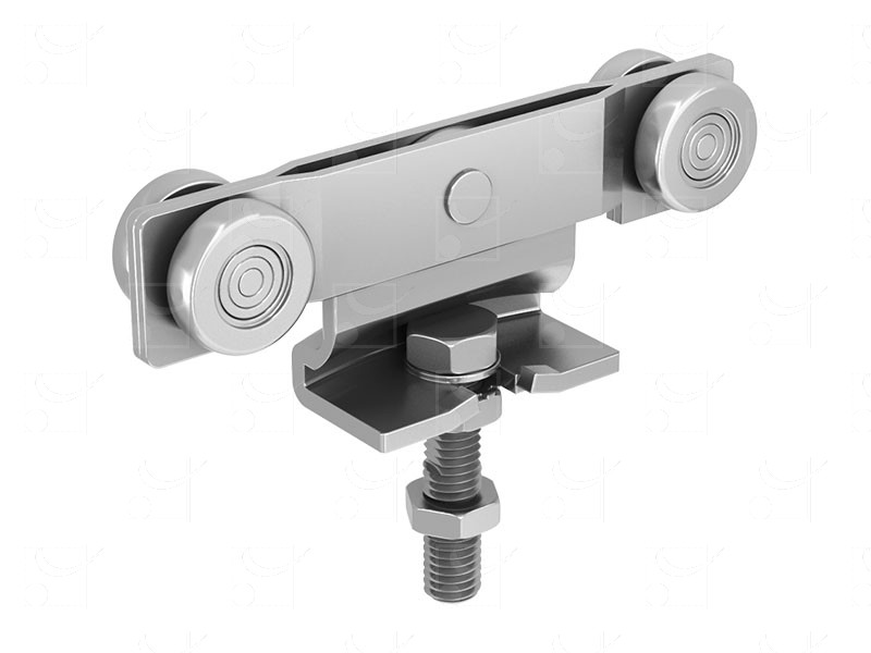 Monture avec support col de cygne, 4 galets en acier montés sur roulements à billes. Vis M20. Capacité/porte : 600 Kg. Rail associé 9050.